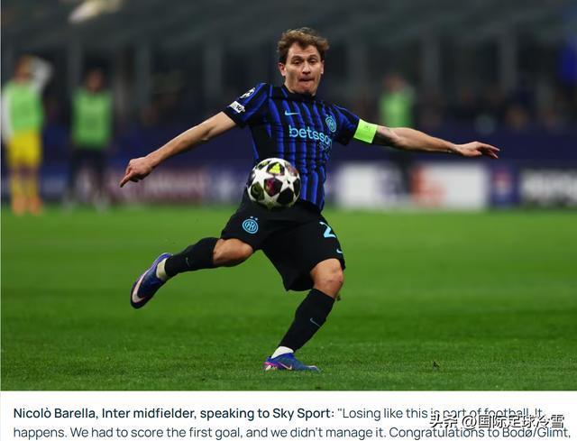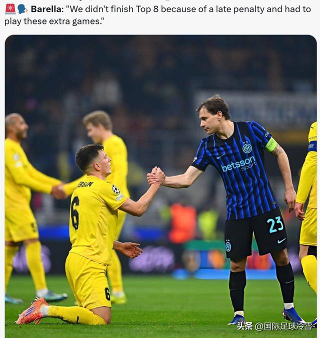 其一,是此战佩戴国米队长袖标的巴雷拉赛后引发极大争议的表态,他先是将国米欧冠出局归咎于“踢利物浦时完场前的点球,导致球队被迫多踢两场附加赛”,随后谈及本战时表示:“像这样输掉比赛,是足球的一部分,这是可能发生的……我们努力了,但他们比我们更强。”