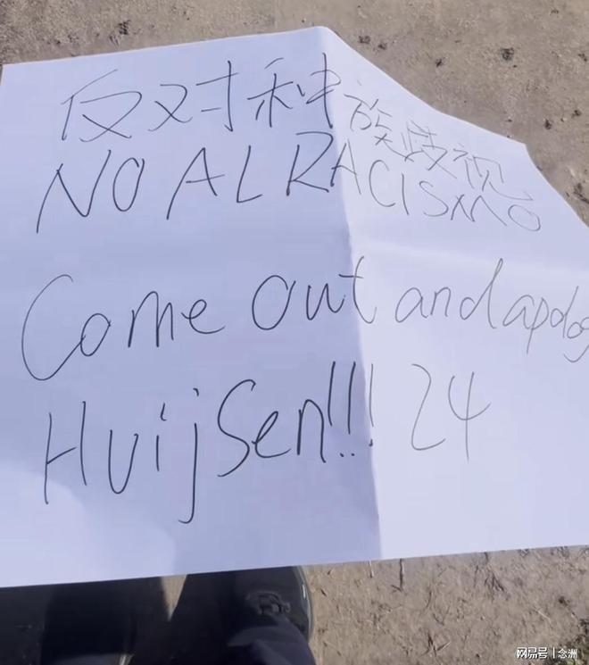 一名在西班牙的中国球迷连续两天在皇马的训练基地门口高举牌子抗议,牌子上写着“反对种族歧视,赫伊森出来道歉”!第二天,他成功蹲到赫伊森,但赫伊森看到他之后就加速开车跑了,还险些撞到他。
