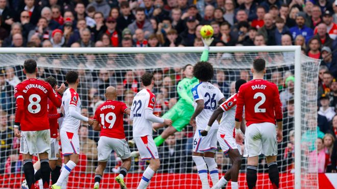 第42分钟,廉田大地放倒姆伯莫,曼联获得前场位置不错的任意球,B费的射门绕过人墙,昔日队友亨德森飞身将球托出横梁。
