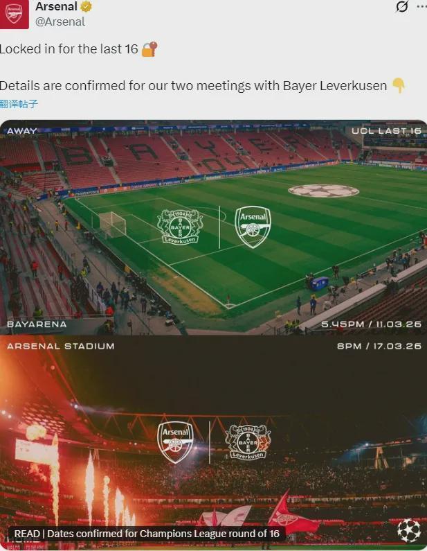 官方:阿森纳将在欧冠八分之一决赛中对阵勒沃库森。