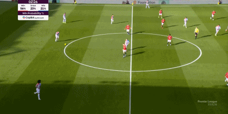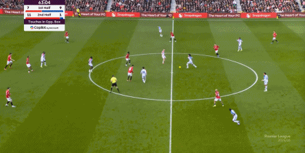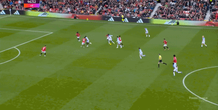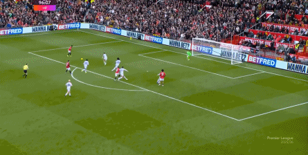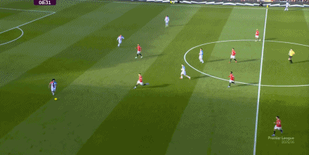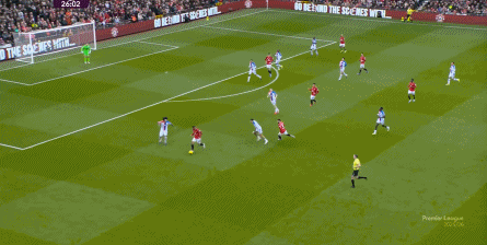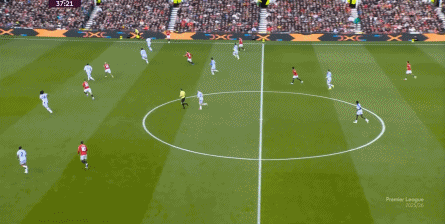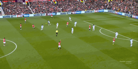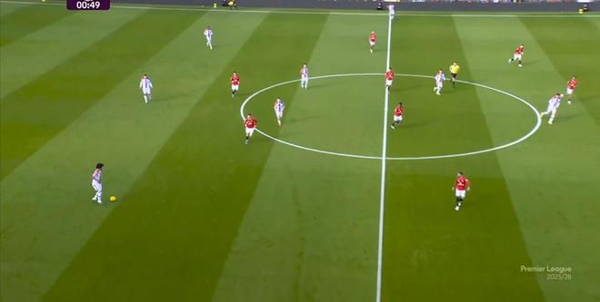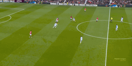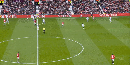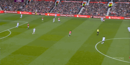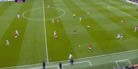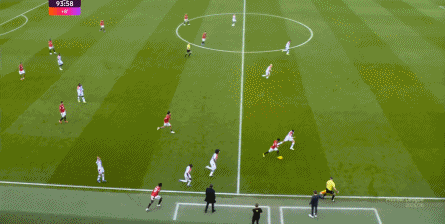 在这场比赛之前,曼联的进攻思路是充分拉高跑动量,让前场四人自由换位,甚至形成某个半扇或局部的集聚态势,这场比赛也不是没有这样的例子,就像第11分钟,库尼亚便来到右路,和姆贝乌莫形成一前一后的站位,从而在右路送上传中: