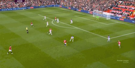 他不换位,库尼亚换位,就会形成站位上的彻底倾斜,这对于转换时的防守建制是一个不可忽视的问题,哪怕布鲁诺可以临时换到左路,但你指望超过31岁的他去覆盖超过30岁的卢克-肖的身侧,让穆尼奥斯在空位里的拿球不那么轻松,也是不现实的: