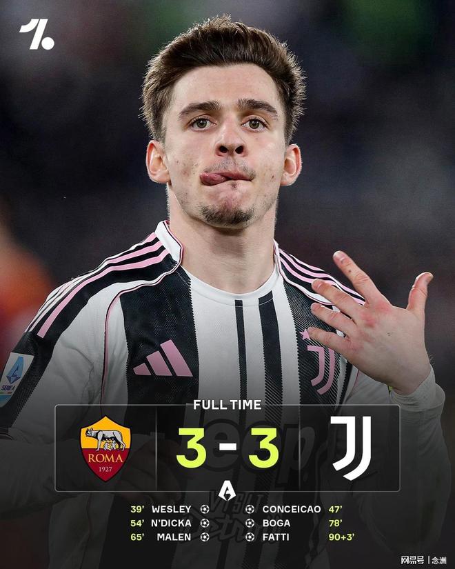 意甲第27轮,罗马主场3-3战平尤文,51分第四,尤文47分第六。韦斯利先拔头筹,小孔塞桑超级世界波,恩迪卡建功,马伦单刀破门加盟后7场6球,博加替补破门,加蒂替补绝平。