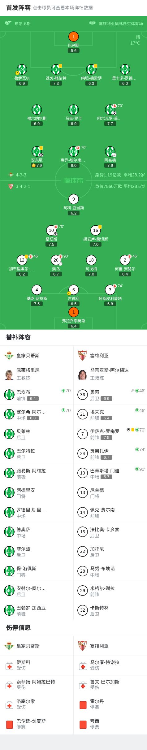 皇家贝蒂斯vs塞维利亚:安东尼、里卡多-罗德里格斯首发,桑切斯、阿斯皮利奎塔出战