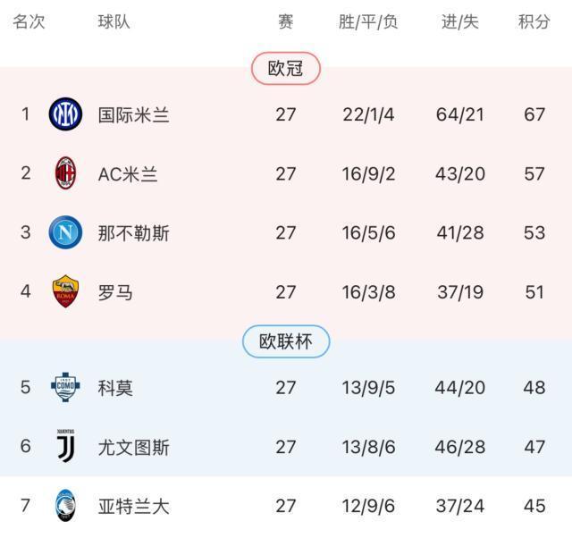 随着AC米兰2-0,尤文图斯3-3,亚特兰大1-2,意甲最新积分榜出炉