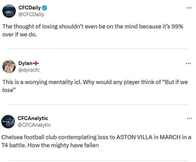 另一位球迷写道:“切尔西足球俱乐部竟然在三月的第四名争夺战中考虑输给阿斯顿维拉的可能性。强者是如何衰落的?”