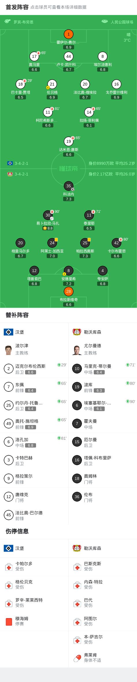 汉堡vs勒沃库森:法比奥-维埃拉、卢卡-武什科维奇首发,格里马尔多、夸安萨出战