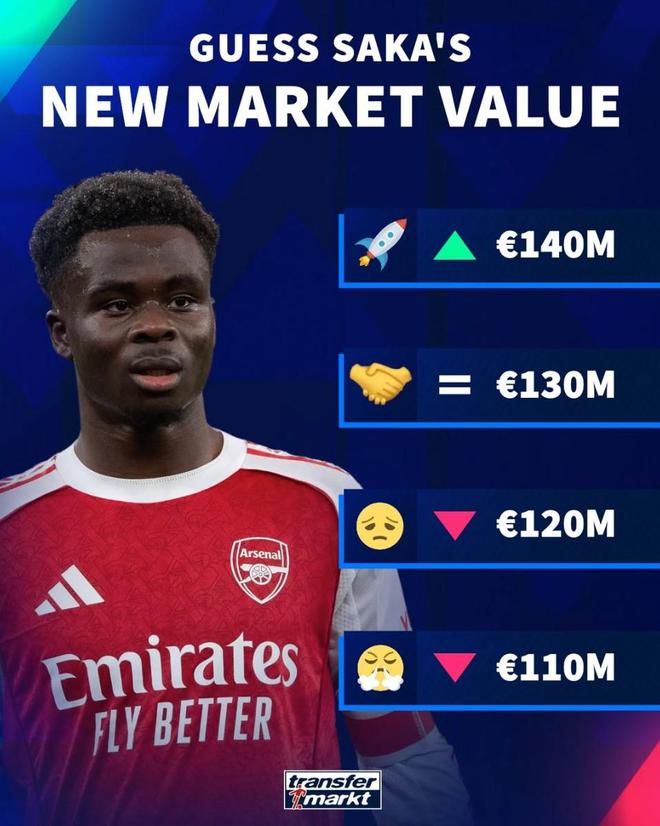 在德转3月9日将会更新英超球员身价的情况下,他们也对现有身价1.3亿欧元的萨卡进行了身价预热。在德转给出的4个选项中,萨卡身价最高涨至1.4亿欧元,其次是1.3亿欧元保持不变,然后是下降至1.2亿欧元以及1.1亿欧元。