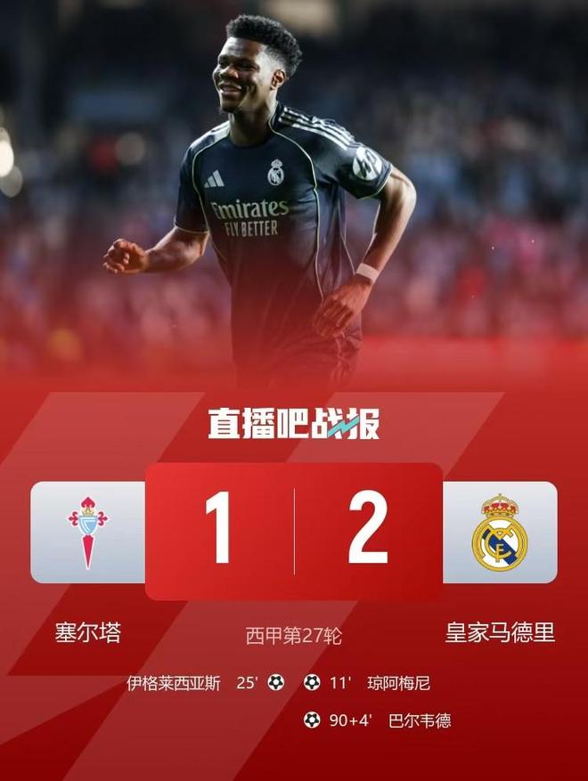 之后的七十多分钟里双方互有攻防却都难再破门得分,就当所有人都以为本场将以平局收场之际,巴尔韦德再度展现了他超硬的脚头,提前一步抢到塞尔塔解围不远的皮球,随后调整一步施展穿云箭,皮球在经过多次折射后破门得分完成读秒绝杀,为皇马惊险抢下三分。