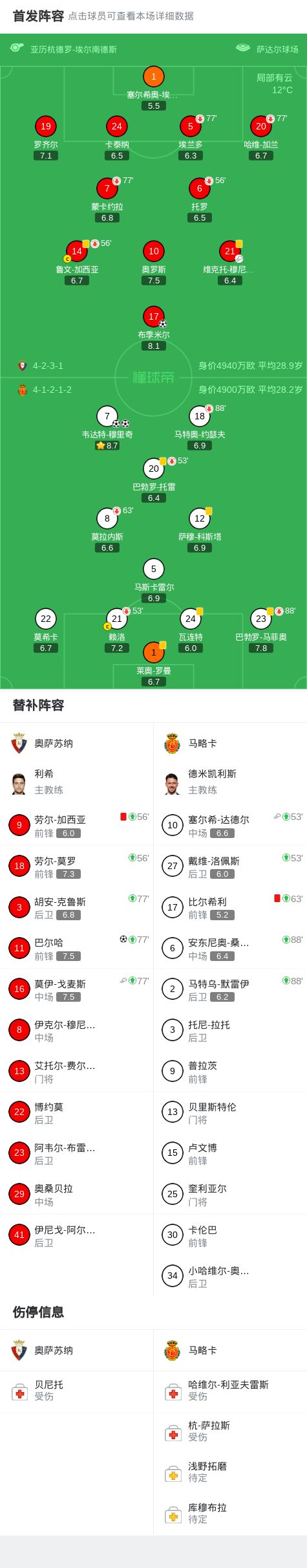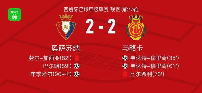 北京时间3月7日西班牙足球甲级联赛 联赛 第27轮,奥萨苏纳主场对阵马略卡。奥萨苏纳巴尔哈破门,布季米尔破门。马略卡韦达特-穆里奇梅开二度。最终比分奥萨苏纳 2-2 马略卡。