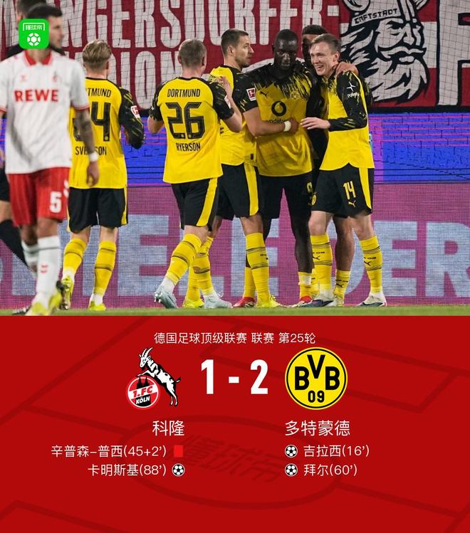 北京时间3月8日德国足球顶级联赛 联赛 第25轮,科隆主场对阵多特蒙德。上半场拜尔头球送助攻,吉拉西铲射破门,半场补时阶段辛普森-普西背后踩踏拜尔,裁判回看后改判红牌。下半场拜尔与布兰特配合后破门扩大比分,比赛尾声卡明斯基折射破门扳回一球。最终多特2-1客胜十人科隆。