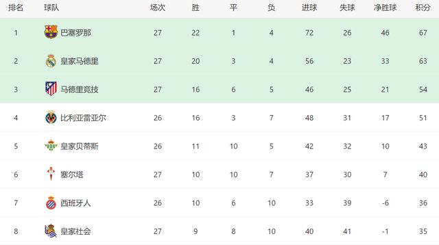截至目前,27轮过后,巴萨22胜1平4负拿到67分,在积分榜上以4分的优势领跑。不过尽管如此,巴萨在西甲还是不能松懈,因为后面11轮比赛,他们还有2场恶战要打,万一这2场比赛都拿不到3分,巴萨随时会丢掉冠军。