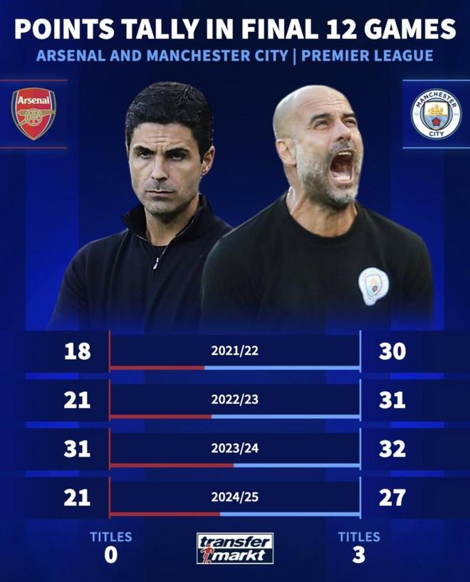 你这张统计把冲刺段的差距摆得很直白:同样看“最后12场”,阿森纳的起伏明显更大,而曼城往往越跑越稳。
