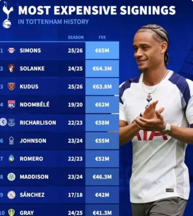 6500万欧元,34场2球5助,身穿孙兴慜留下的7号球衣。这三个数字放在一起,就是对西蒙斯本赛季最残酷的总结。