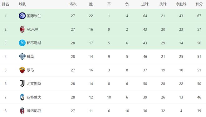 在积分榜上,国际米兰依然遥遥领先,以67分高居榜首,战绩是22胜1平4负。排名第2的是AC米兰,只拿到57分,足足落后10分。显然,意甲的冠军归属基本失去了悬念。卫冕冠军那不勒斯只拿到56分,排名第3。科莫赢球之后,总积分达到51分,升到了第4名。而同样51分的罗马掉到第5名。尤文图斯50分,在争四集团中稍稍落后,排名第6。