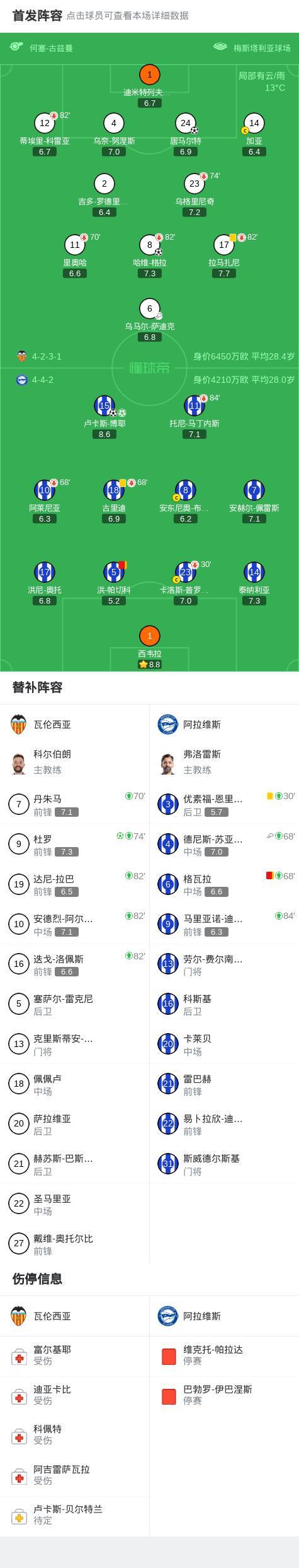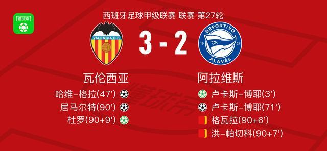 北京时间3月9日西班牙足球甲级联赛 联赛 第27轮,瓦伦西亚主场对阵阿拉维斯。瓦伦西亚哈维-格拉破门,居马尔特破门,杜罗破门。阿拉维斯卢卡斯-博耶梅开二度。最终比分瓦伦西亚 3-2 阿拉维斯。