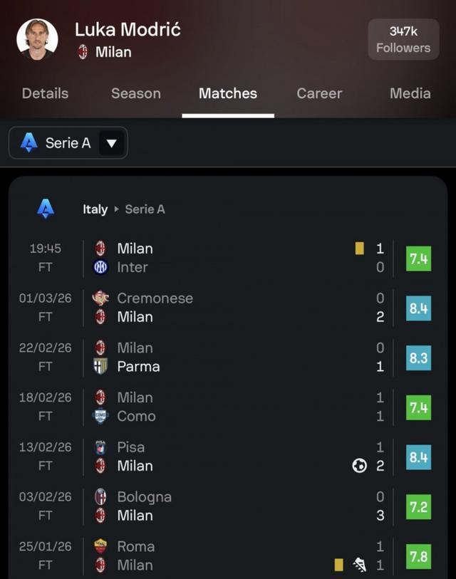 Sofascore此役对40岁的莫德里奇给出了7.4分,近7场比赛的评分均高于7分,场均评分7.8,确定这是40岁老将?