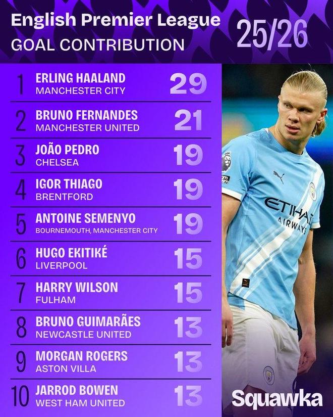 数据机构Squawka统计了本赛季英超球员的参与进球(进球+助攻)数量,并列出榜单。曼城前锋哈兰德以29球高居榜首,展现出恐怖的进攻效率。曼联核心B费以21球位列次席,切尔西前锋若昂·佩德罗与布伦特福德前锋伊戈尔·蒂亚戈、曼城边锋塞梅尼奥同以19球并列第三。