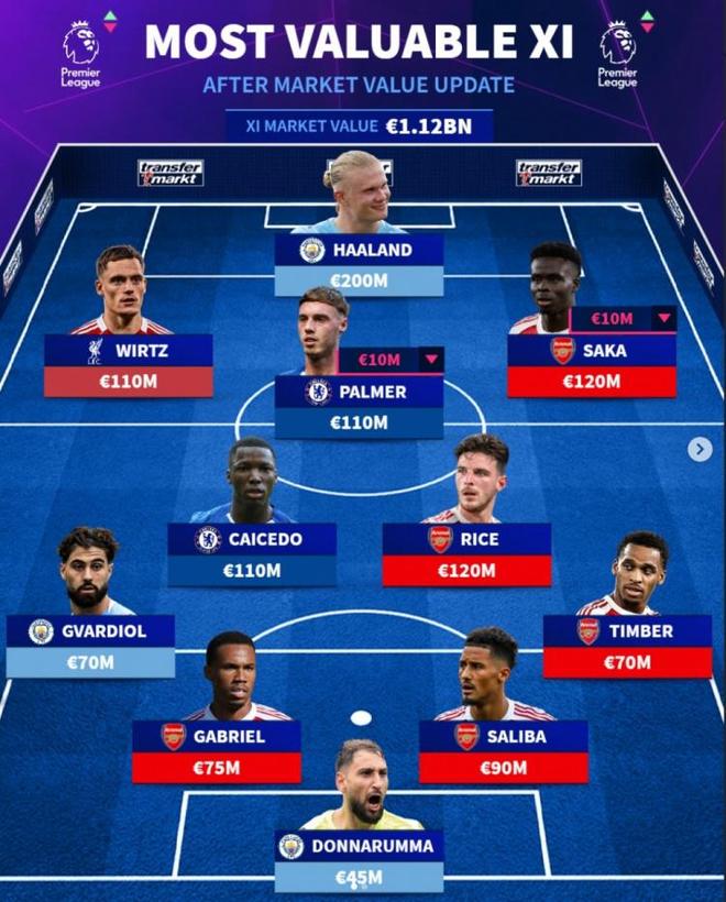4 - 德转更新英超身价最贵阵:哈兰德2亿欧领衔,阿森纳5将入选