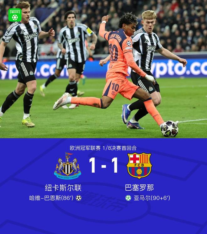 北京时间3月11日欧洲冠军联赛 1/8决赛首回合,纽卡斯尔联对阵巴塞罗那。纽卡斯尔联哈维-巴恩斯破门。巴塞罗那亚马尔破门。最终比分纽卡斯尔联 1-1 巴萨。
