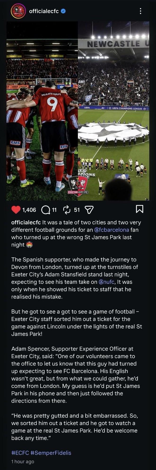 英格兰低级别联赛俱乐部埃克塞特城近日在社交媒体上分享了一段有趣的球迷经历:一名远道而来的西班牙巴萨球迷,因为导航错误,误把埃克塞特的圣詹姆斯公园球场当成了纽卡斯尔联的主场,闹出了一场“跑错球场看球”的乌龙。