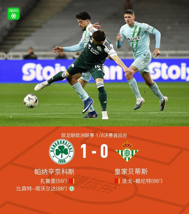 北京时间3月13日欧足联欧洲联赛 1/8决赛首回合,帕纳辛奈科斯对阵皇家贝蒂斯。下半场扎鲁里两黄一红被罚离场,希维德尔斯造点,塔沃尔达点射打入制胜球,迭戈-略伦特两黄一红被罚离场。最终比分帕纳辛奈科斯 1-0 皇家贝蒂斯。