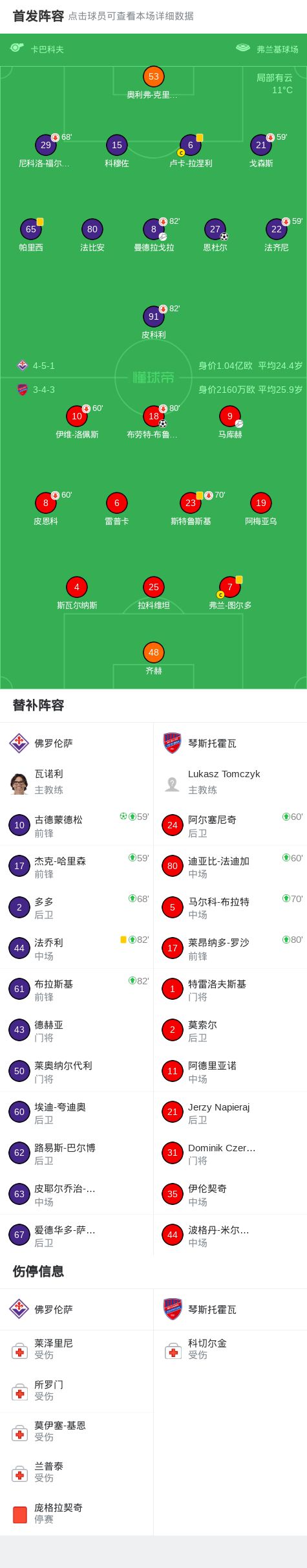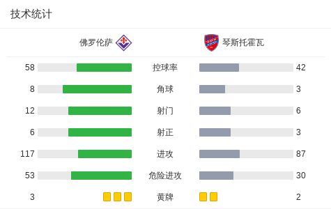 半场:佛罗伦萨0-0琴斯托霍瓦,科穆佐中框