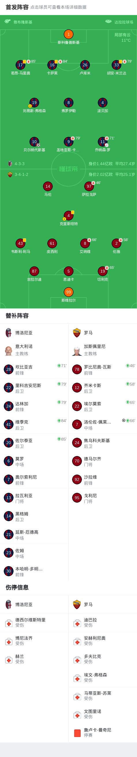 第71分钟,马伦助攻,佩莱格里尼破门扳平比分,博洛尼亚1-1罗马