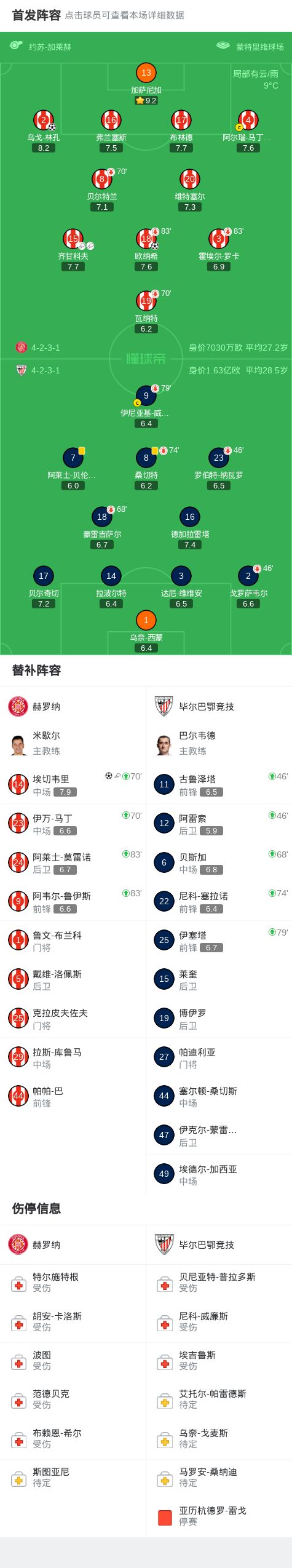 赫罗纳3-0大胜毕尔巴鄂竞技,埃切韦里替补1传1射,欧纳希破门